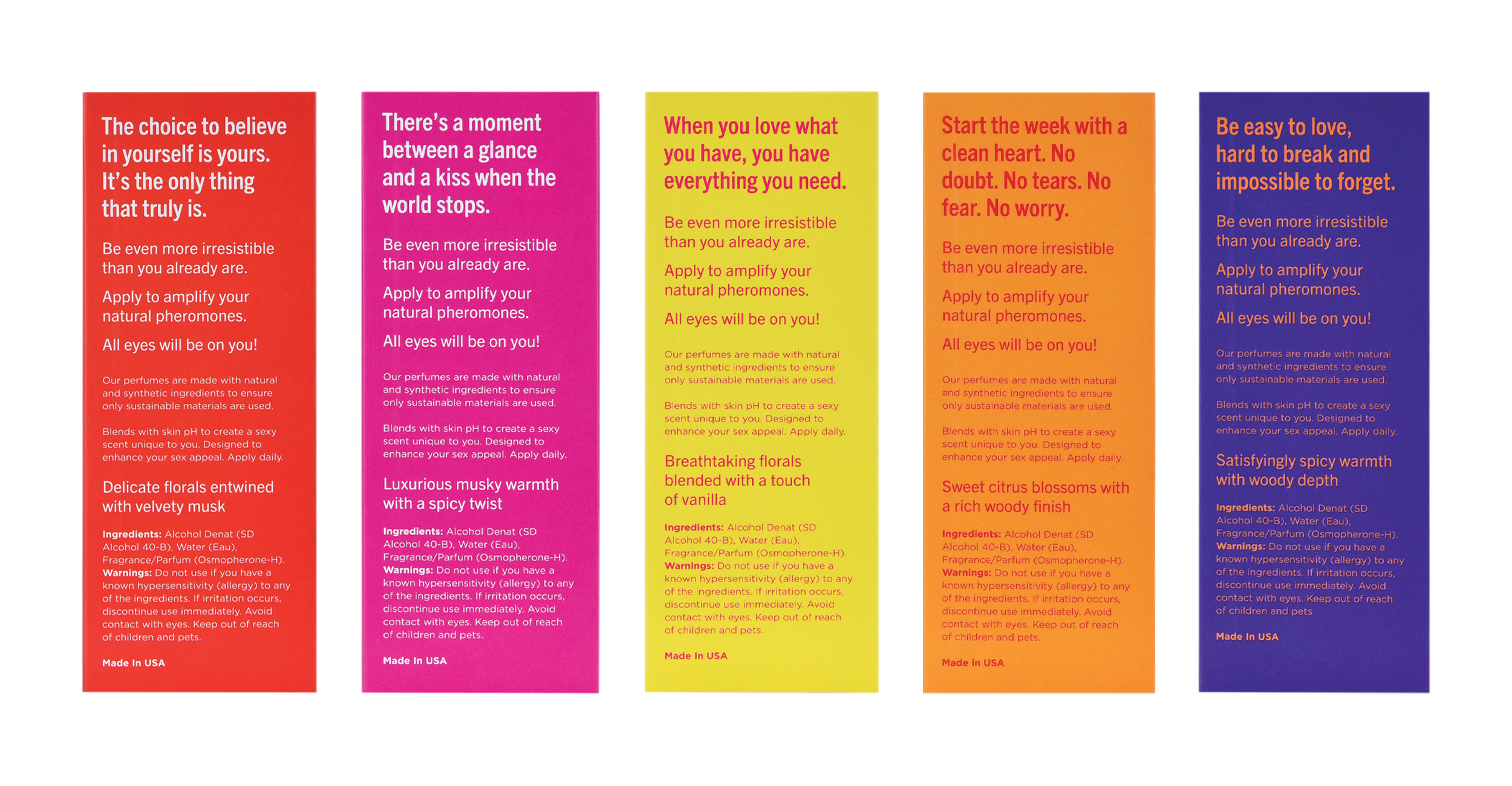 Simply Sexy is a brand that designs pheromone infused fragrances for women. During my time at Classic Brands, this was my favorite project to work on because my creative director and I had the opportunity to reinvent the look and feel of the brand. We used colors that pop and catch the viewer’s attention, and decided to use wrap-around text for engagement. We rolled out these fragrances in forms of perfumes, body mists, and roll-ons.